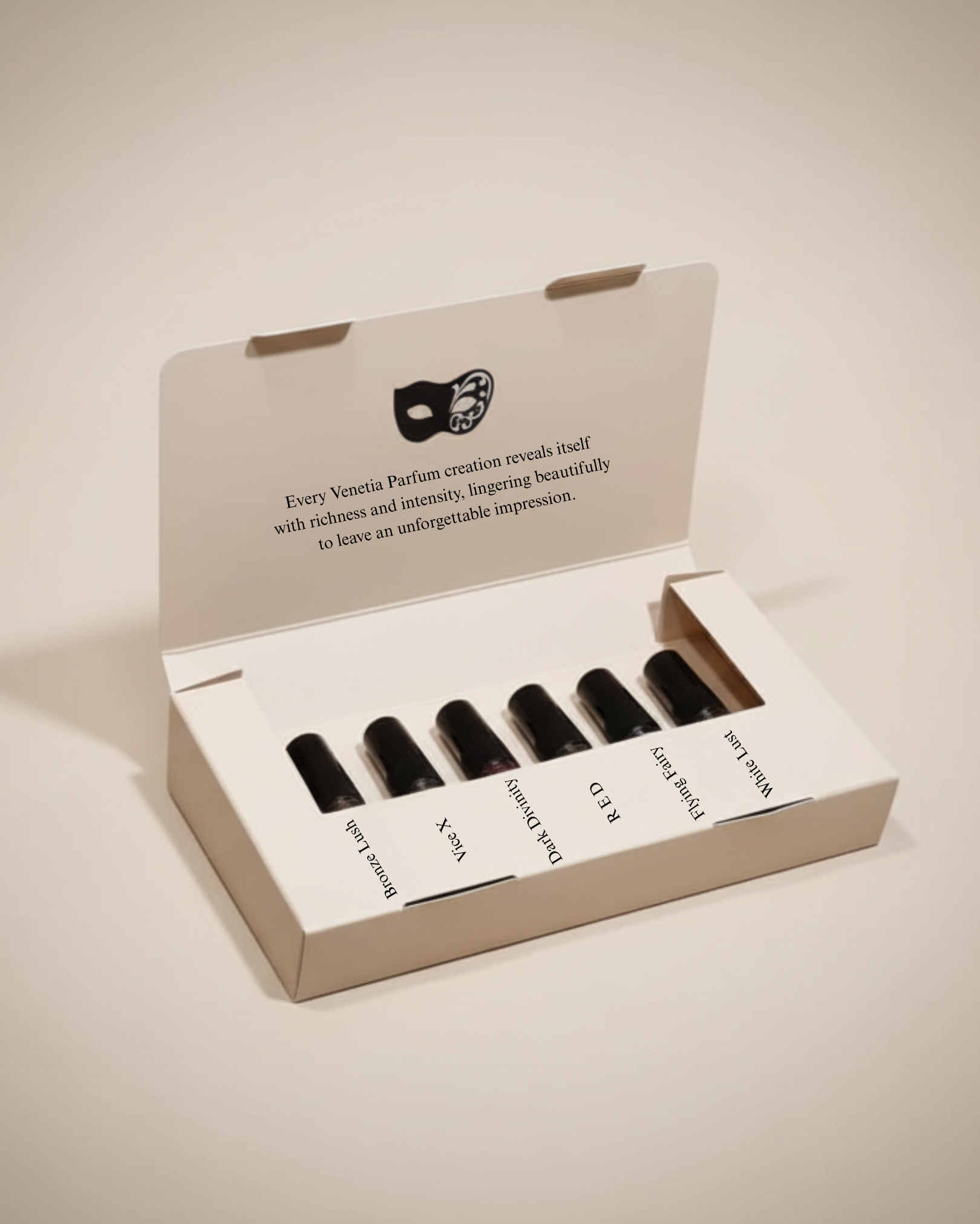 Contains 6 x 5ml Extrait de Parfum Vials + Golden Sucre: